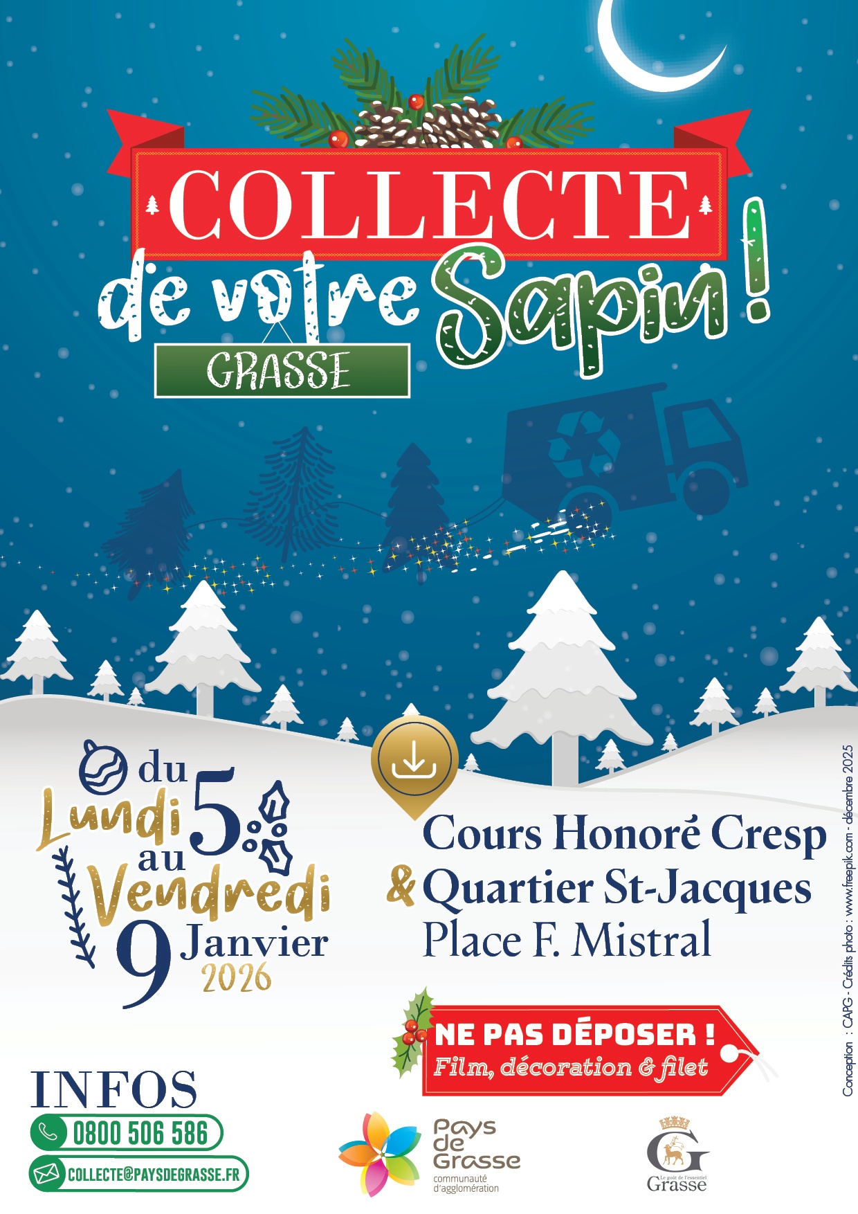 Remportant un vif succès chaque année, la Communauté d'Agglomération du Pays de Grasse renouvèle du lundi 5 au vendredi 9 janvier 2026 son opération de collecte des sapins de Noël sur 4 communes du territoire.