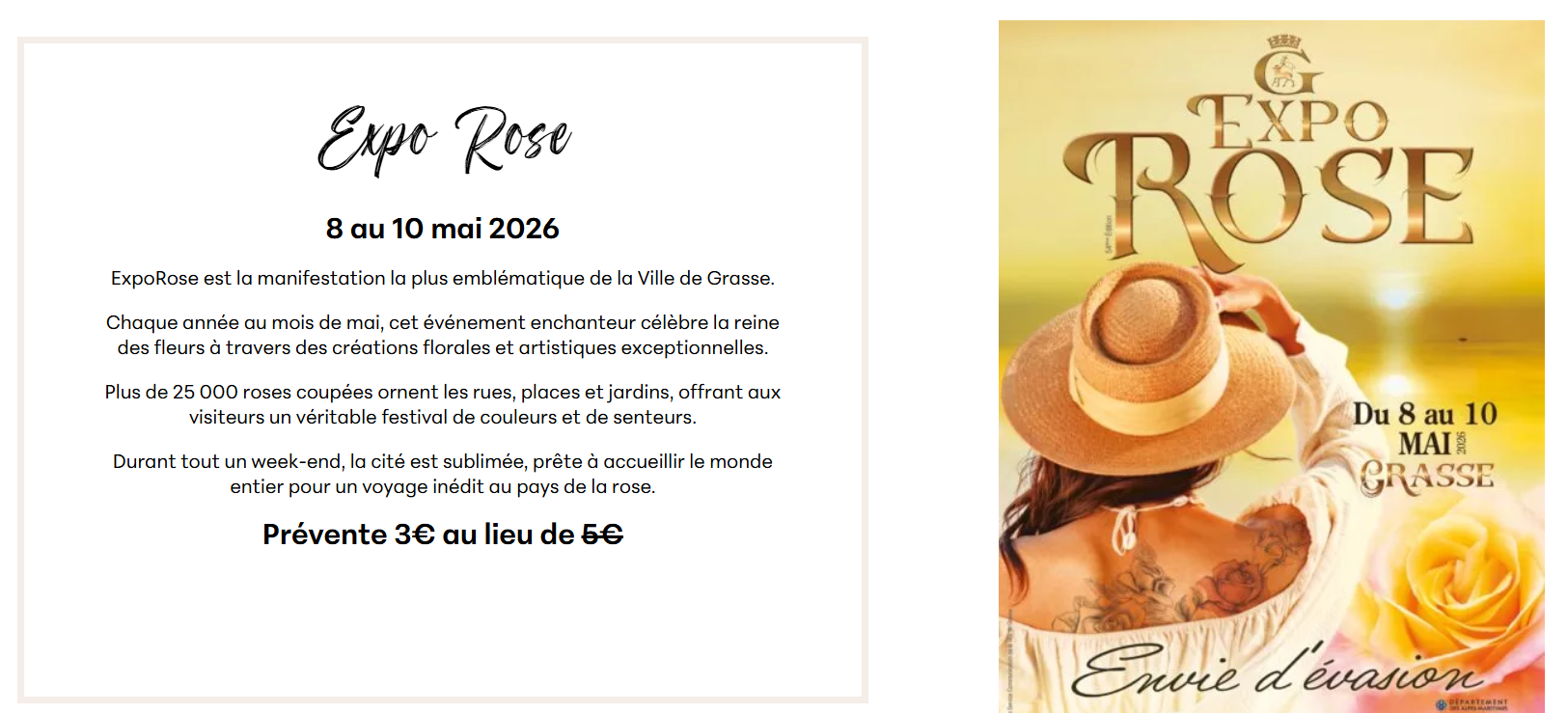 Pour ExpoRose 2026, réservez vos billets en avance afin de ne rien manquer de l'effervescence de LA manifestation de l'année à Grasse.