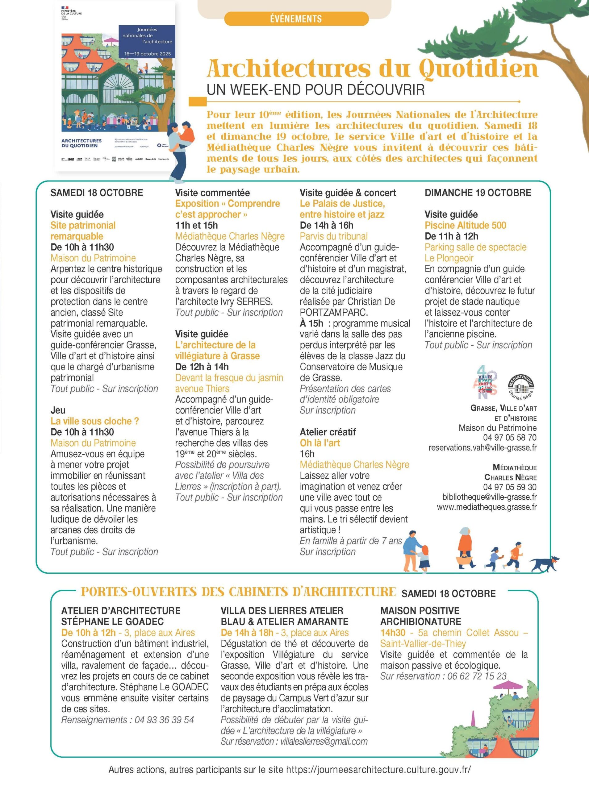 Les Journées Nationales de l'architecture proposent de découvrir l'étendu du patrimoine de la ville dans sa version la plus complète. Au travers d'ateliers, de visites guidées, d'exposition et de témoignages, Grasse dévoile son architecture et les secrets de ses bâtiments. Cette année, le thème "𝘕𝘰𝘶𝘷𝘦𝘭𝘭𝘦𝘴 𝘷𝘪𝘦𝘴 𝘥𝘦𝘴 𝘣𝘢̂𝘵𝘪𝘮𝘦𝘯𝘵𝘴 𝘦𝘵 𝘯𝘰𝘶𝘷𝘦𝘭𝘭𝘦𝘴 𝘱𝘳𝘢𝘵𝘪𝘲𝘶𝘦𝘴 𝘥𝘦 𝘭'𝘢𝘳𝘤𝘩𝘪𝘵𝘦𝘤𝘵𝘶𝘳𝘦" est mis en lumière par la Bibliothèque & Médiathèques Charles Nègre et la Maison du Patrimoine qui proposent un programme complet pour toute la famille.