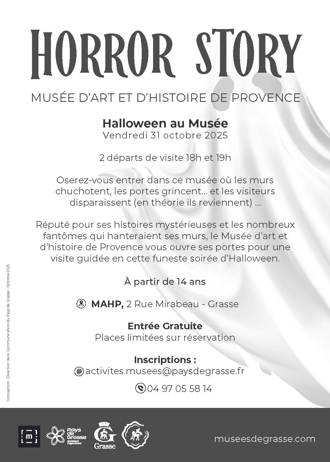 Les Vacances Culturelles de Halloween à Grasse ouvrent les portes des établissements culturels de la ville pour des activités et des animations aussi frissonnantes qu'amusantes ! Vendredi 31 octobre, le Musée d'Art et d'Histoire de Provence, organise une soirée inédite en proposant une visite guidée qui vous plongera dans les mystères des lieux.