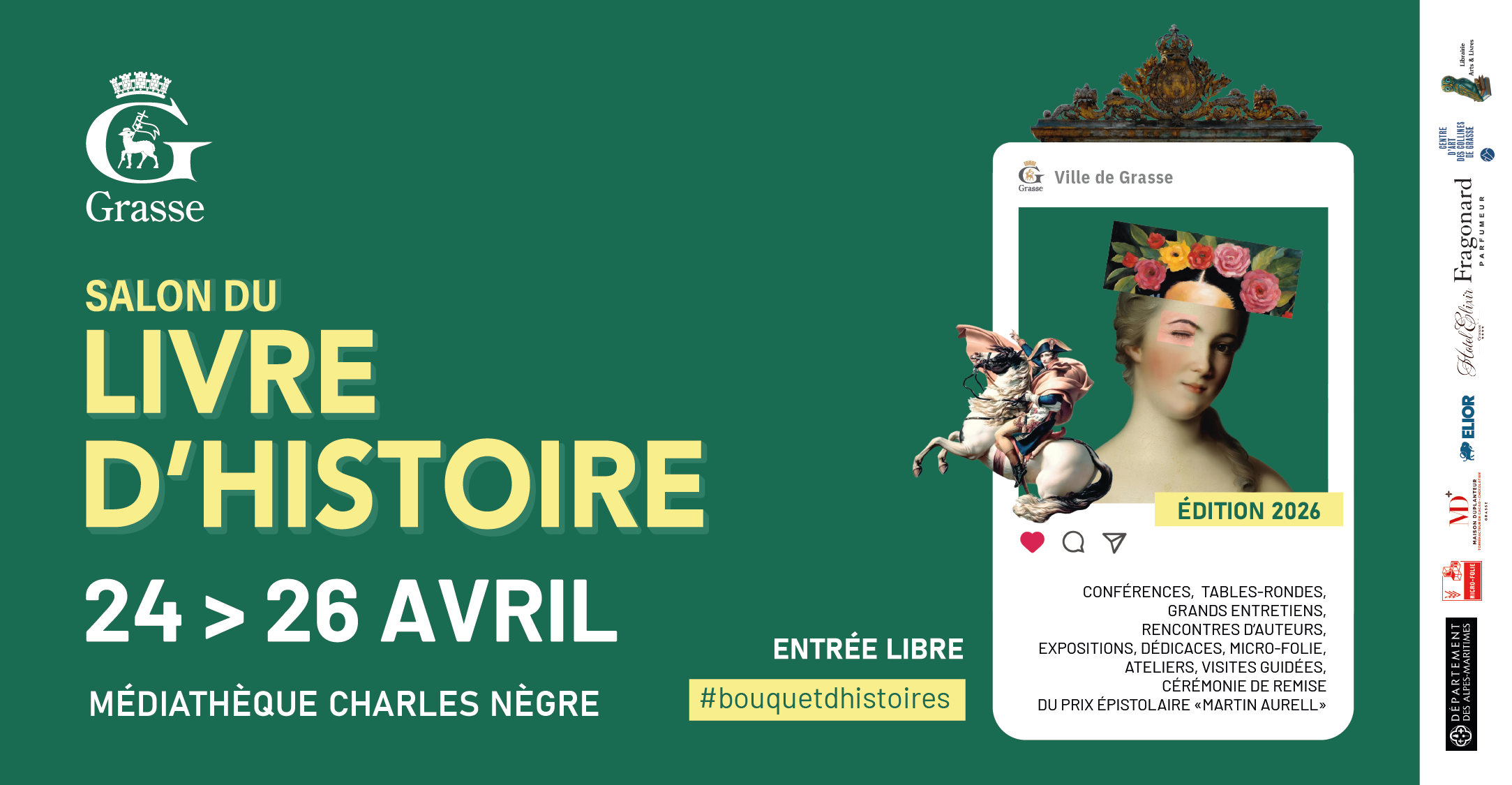 Le Salon du Livre d'Histoire revient pour sa 3e édition à Grasse ! L'opportunité de voyager dans le temps et de s'ouvrir au monde au travers des récits poignants, des ouvrages captivants et des rencontres qui interrogent sur des thématiques culturelles, politiques ou encore patrimoniales. Du 24 au 26 avril 2026, le Palais des Congrès et la Médiathèque Charles Nègre reçoivent auteurs, visiteurs et curieux autour d'ateliers, d'animations, de projections et de table ronde.