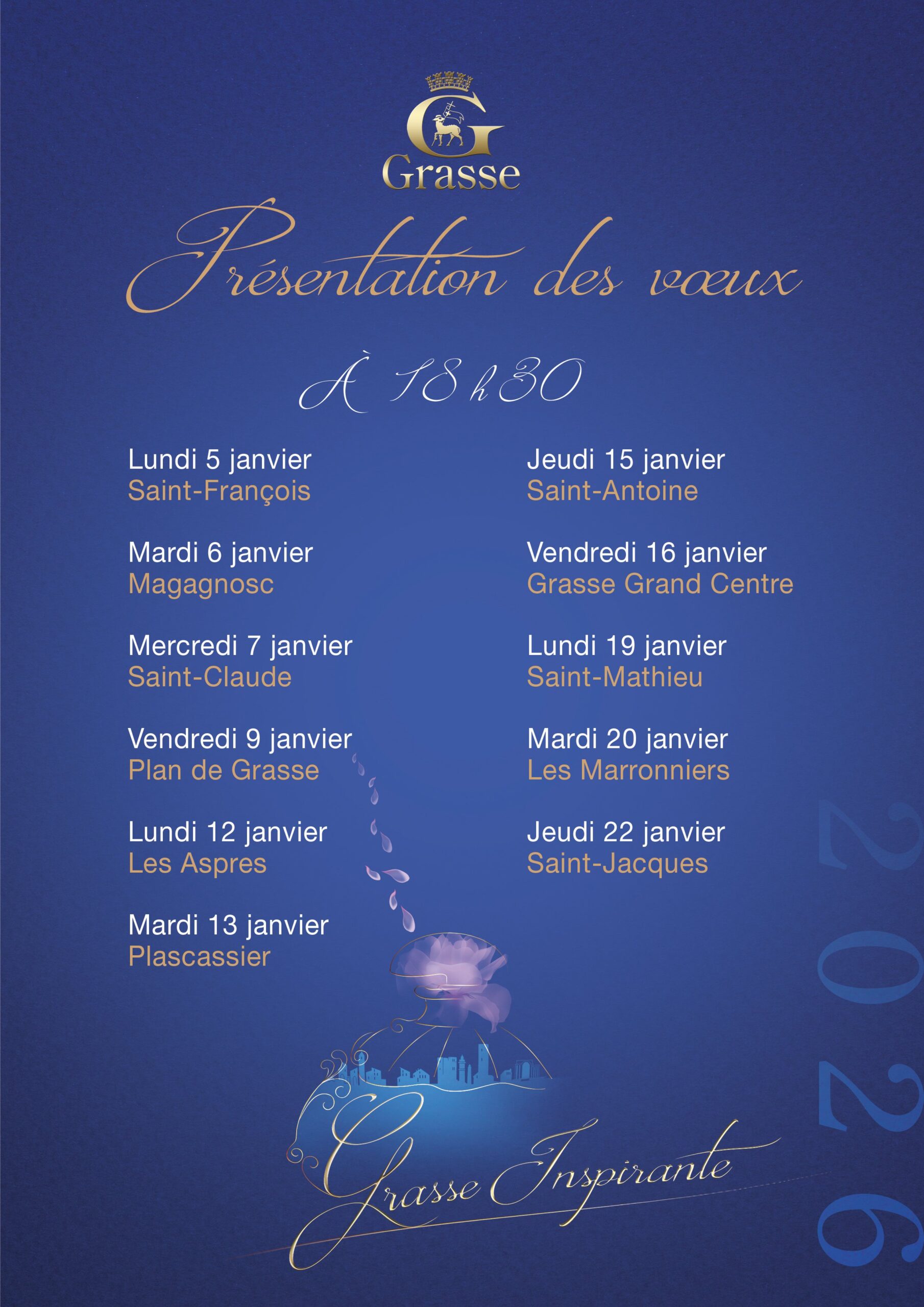 Présentation des vœux 2026 à Grasse et dans ses hameaux ! Vous êtes attendus nombreux à chacune des dates pour célébrer le passage vers cette nouvelle année à Grasse, qui nous fait déjà la promesse d'être inspirante.