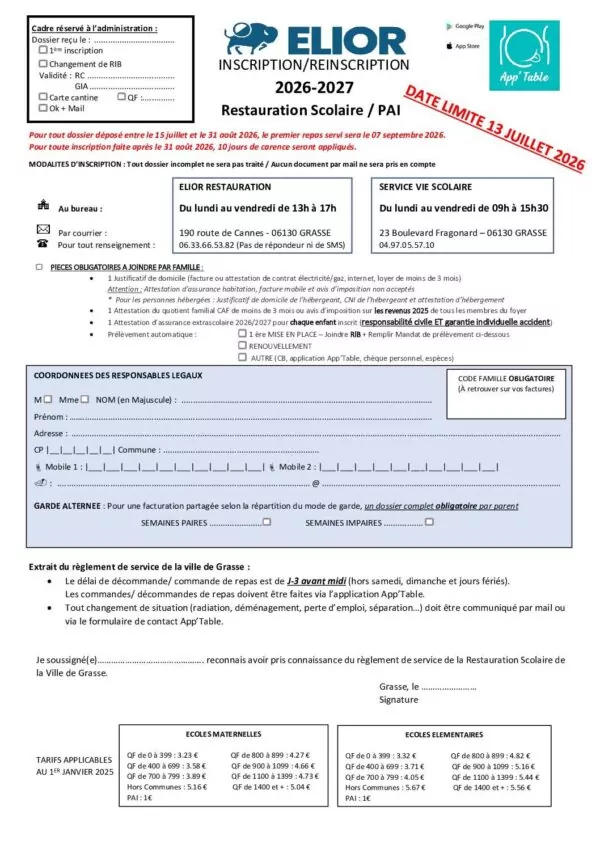 En cas d’absence de l’enfant pour des raisons personnelles, les repas doivent être annulés auprès d’ELIOR trois jours avant afin qu’ils ne soient pas facturés en utilisation l’application « App’ Table ».